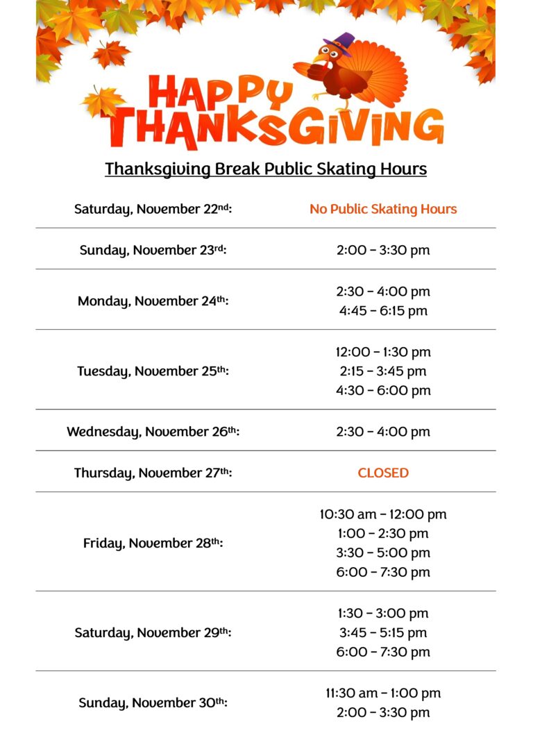 The Ice will be having additional public skating hours for the week of Thanksgiving  (11/23 – 11/30)